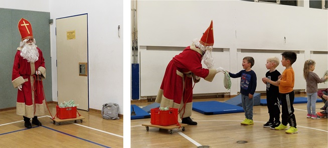 „Mitten im Spiel hörten wir plötzlich lautes Glockenläuten und dann öffnete sich auch schon die Tür zur Turnhalle. Da stand er mit seiner Mütze auf dem Kopf, dem langen, weißen Bart und seinem roten Mantel. Dabei hatte er eine ganze Kiste voller Geschenke. Natürlich wussten wir sofort: das ist der Nikolaus! Nach einer freundlichen Begrüßung zeigten wir ihm einige unserer Turnübungen, die wir zuvor gelernt hatten. Nachdem wir seine Fragen eifrig beantwortet hatten, verteilte der Nikolaus seine Gaben an uns alle. Zum Abschied dankten wir dem Nikolaus für seine Geschenke und wünschten ihm einen guten Weiterweg zu anderen Kindern.“